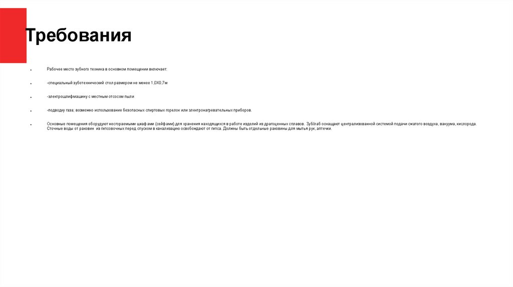 ТребованияРабочее место зубного техника в основном помещении включает: