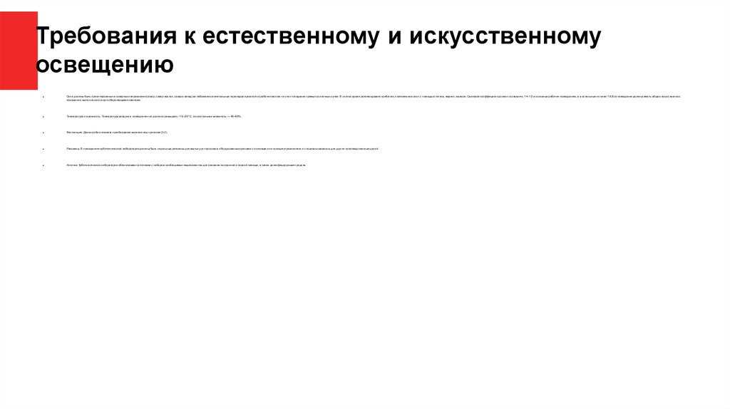 Окна должны быть ориентированы на северные направления (север, север-восток, северо-запад) во избежание значительных перепадов яркостей на рабочих местах на счет попадания прямых солнечных лучей. В летнее время рекомендовано прибегать к затемнению окон с помощью тентов, маркиз, жалюзи. Световой коэффициент должен составлять 1:4-1:5 в основных рабочих помещениях, а в остальных не ниже 1:8.Все помещения должны иметь общее искусственное
