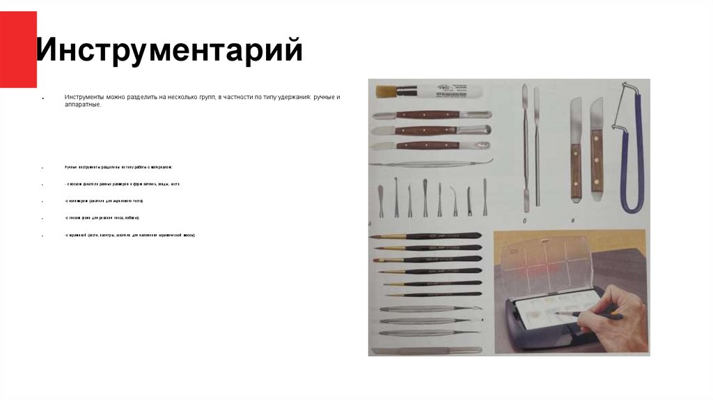 ИнструментарийИнструменты можно разделить на несколько групп, в частности по типу удержания: ручные и