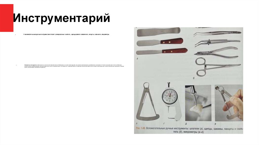 ИнструментарийК вспомогательным ручным инструментам относят универсальные шпатели, щипцы разного назначения, пинцеты, скальпели, микрометры .