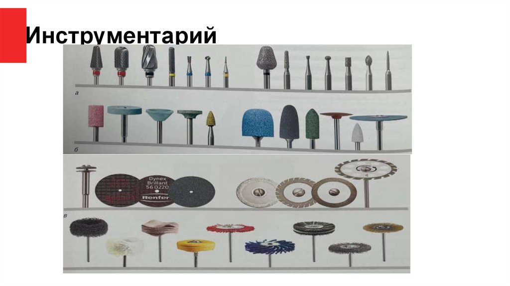 металлические, карборундовые и вулканитовые диски, круги и режущие камни, инструменты с лезвиями (боры) и алмазным напылением (фасонные головки), резиновые круги, войлочные фильцы, ворсовые и пуховые