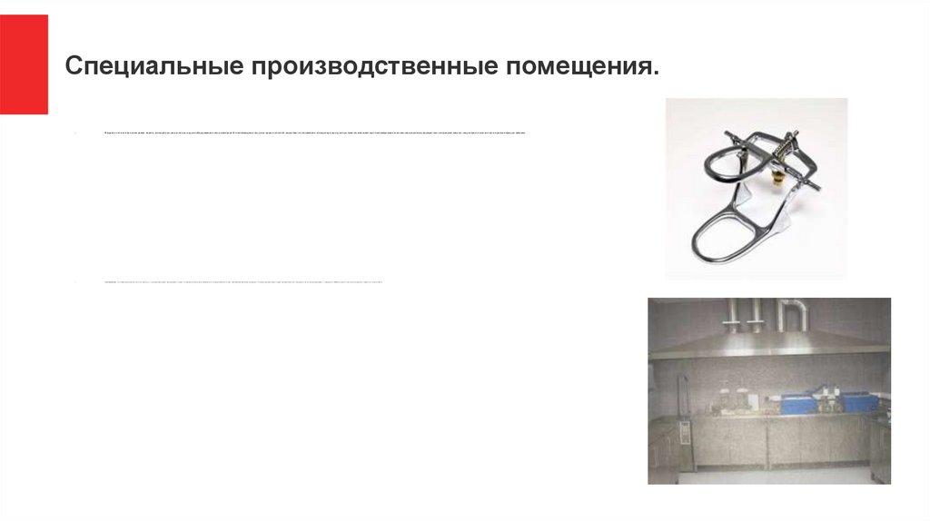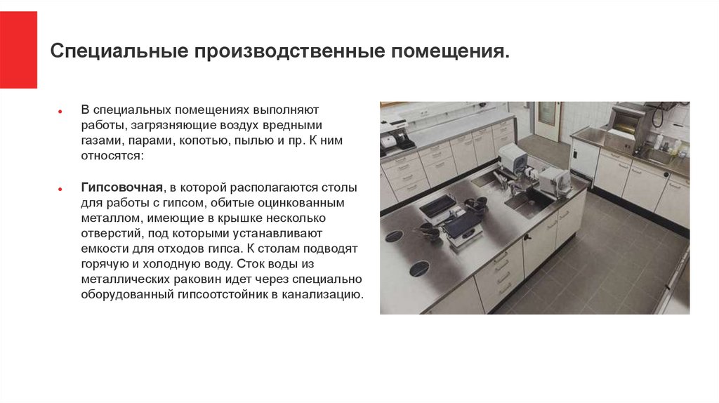 Специальные производственные помещения.В комнате располагают стол, предназначенный для заготовки полимер-мономерного теста из различных пластмасс и его паковки в кюветы. Стол должен иметь гладкую поверхность, легко поддающуюся очистке. На столе укрепляют несколько прессов для прессования пластмассового теста в кюветы. На столе также должен быть герметически закрывающийся сосуд для сбора излишков теста после паковки в кюветы с целью