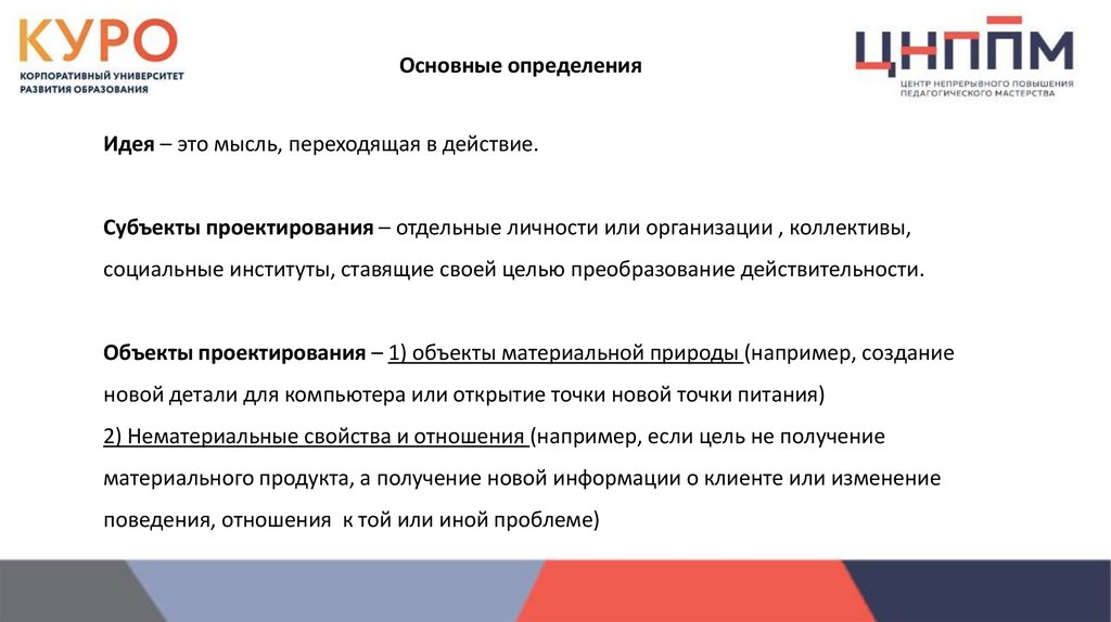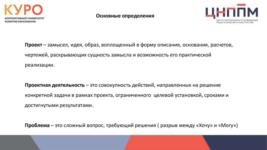 Основные определенияПроект – замысел, идея, образ, воплощенный в форму описания, основания, расчетов,