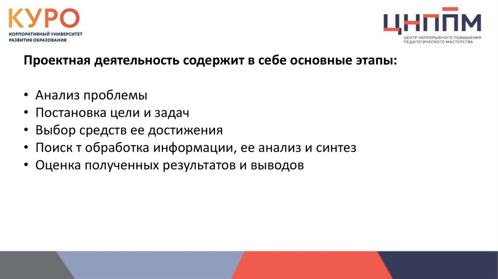 Проектная деятельность содержит в себе основные этапы:• Анализ проблемы