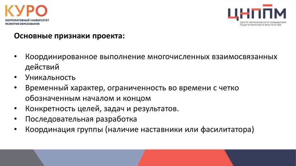 Основные признаки проекта:• Координированное выполнение многочисленных взаимосвязанных