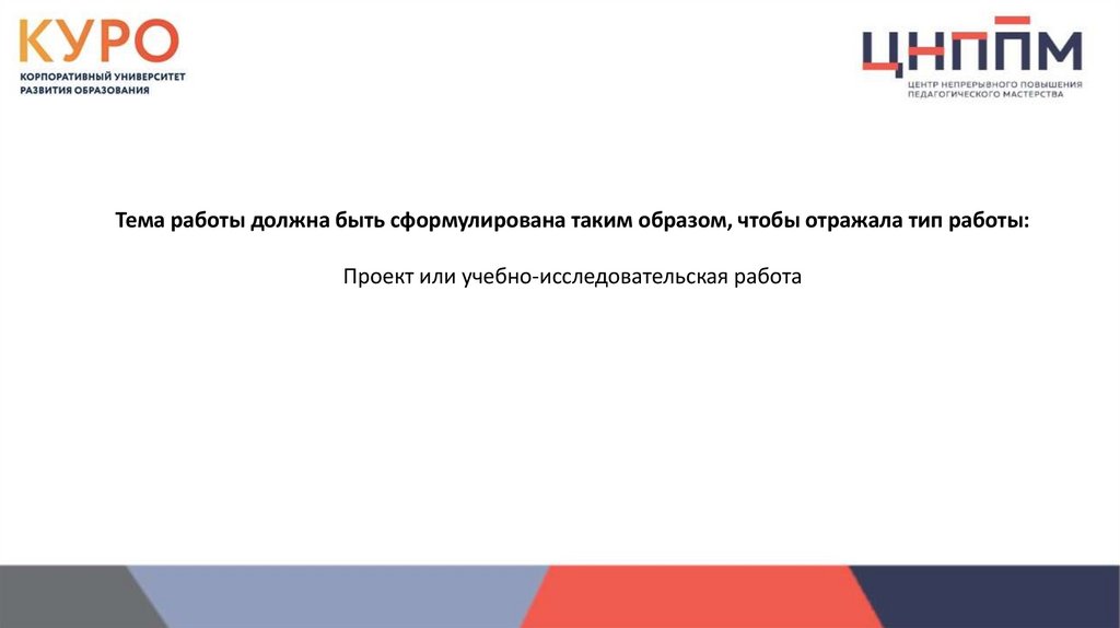 Тема работы должна быть сформулирована таким образом, чтобы отражала тип работы:Проект или учебно-исследовательская работа