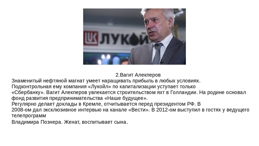 2.Вагит АлекперовЗнаменитый нефтяной магнат умеет наращивать прибыль в любых условиях.