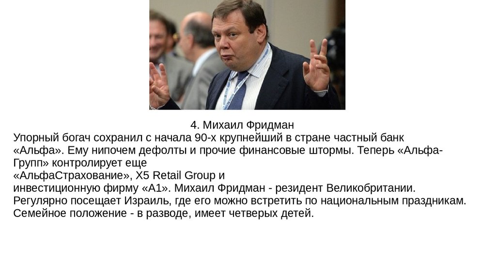 4. Михаил ФридманУпорный богач сохранил с начала 90-х крупнейший в стране частный банк