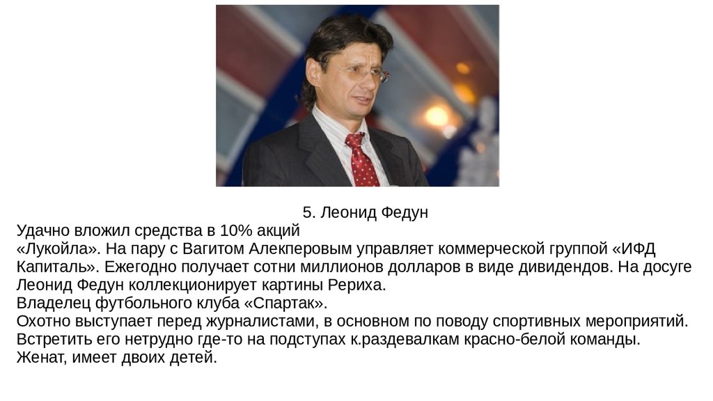 5. Леонид ФедунУдачно вложил средства в 10% акций
