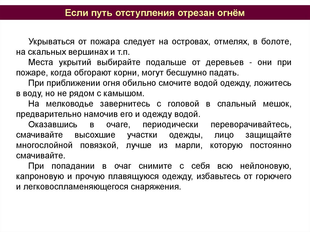 кромку пожара против ветра, укрыв голову и лицо верхней одеждой.