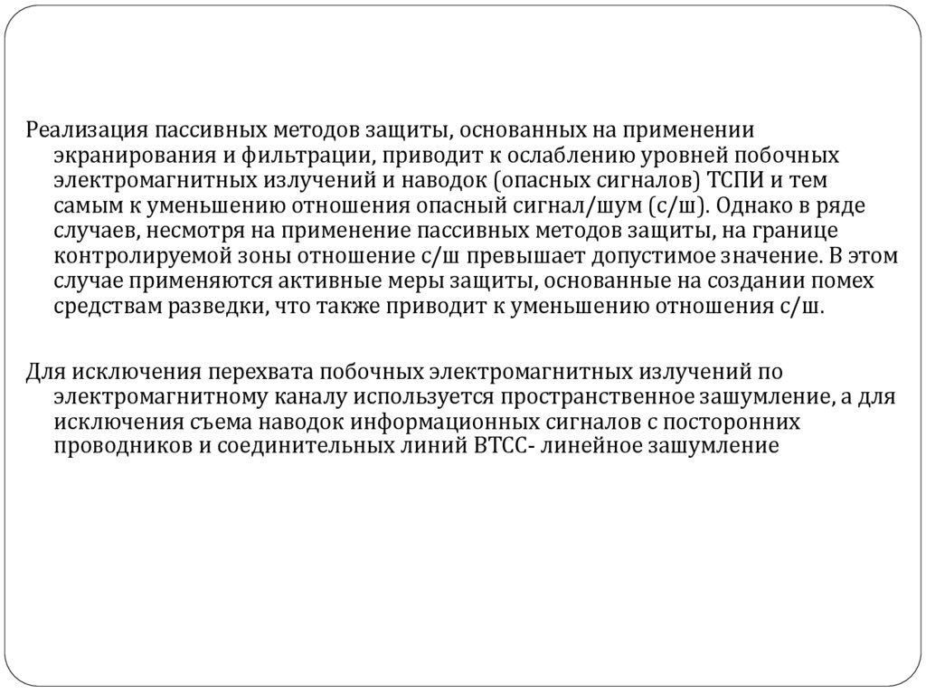 Реализация пассивных методов защиты, основанных на примененииэкранирования и фильтрации, приводит к ослаблению уровней побочных
