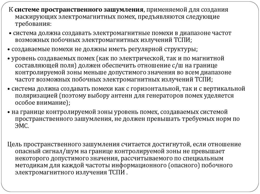К системе пространственного зашумления, применяемой для созданиямаскирующих электромагнитных помех, предъявляются следующие