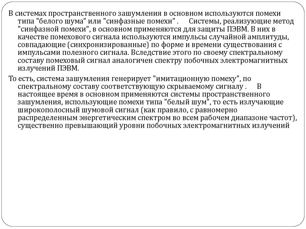 В системах пространственного зашумления в основном используются помехитипа "белого шума" или "синфазные помехи" . Системы, реализующие метод