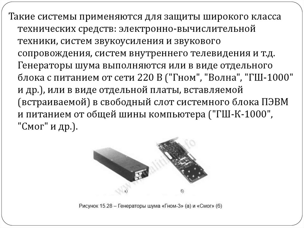 Такие системы применяются для защиты широкого классатехнических средств: электронно-вычислительной