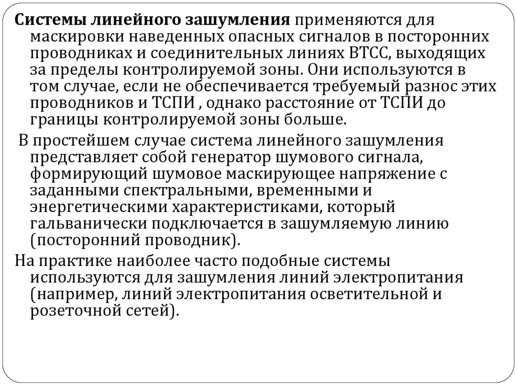 Системы линейного зашумления применяются длямаскировки наведенных опасных сигналов в посторонних