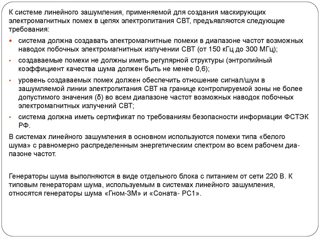 К системе линейного зашумления, применяемой для создания маскирующихэлектромагнитных помех в цепях электропитания СВТ, предъявляются следующие