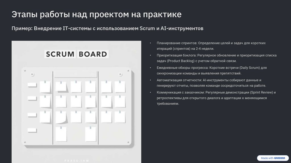 Этапы работы над проектом на практикеПример: Внедрение IT-системы с использованием Scrum и AI-инструментов