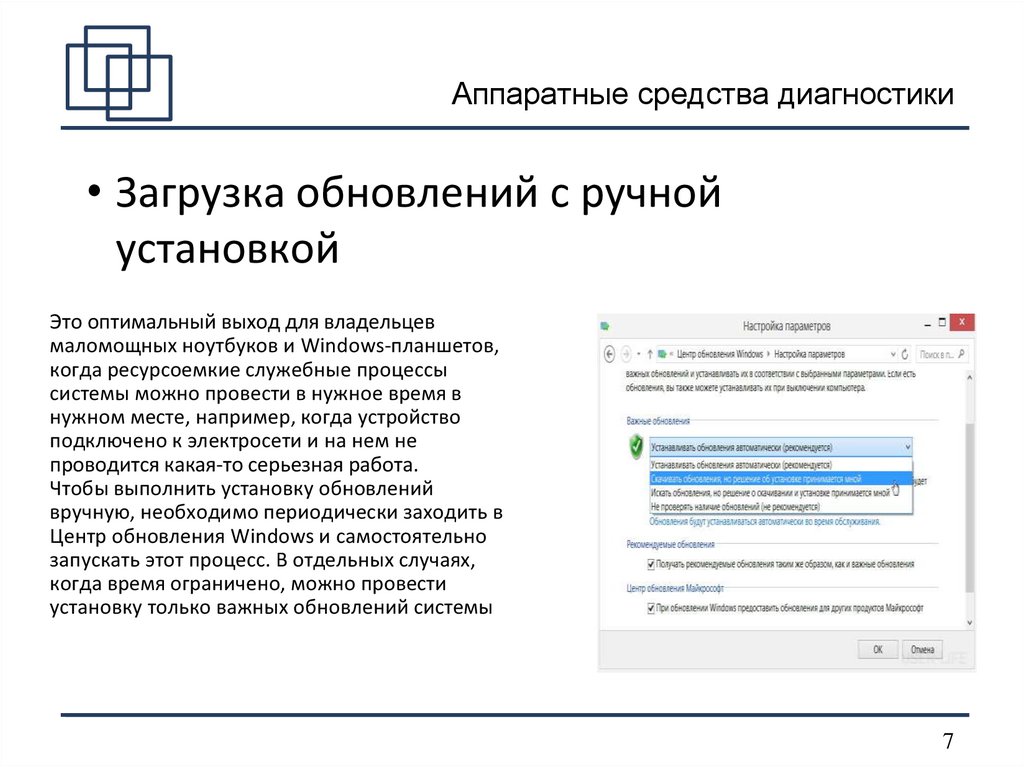 Аппаратные средства диагностики• Загрузка обновлений с ручной