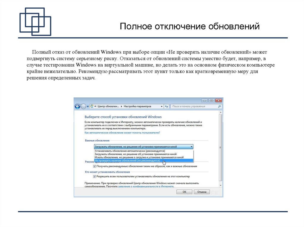 Полное отключение обновленийПолный отказ от обновлений Windows при выборе опции «Не проверять наличие обновлений» может