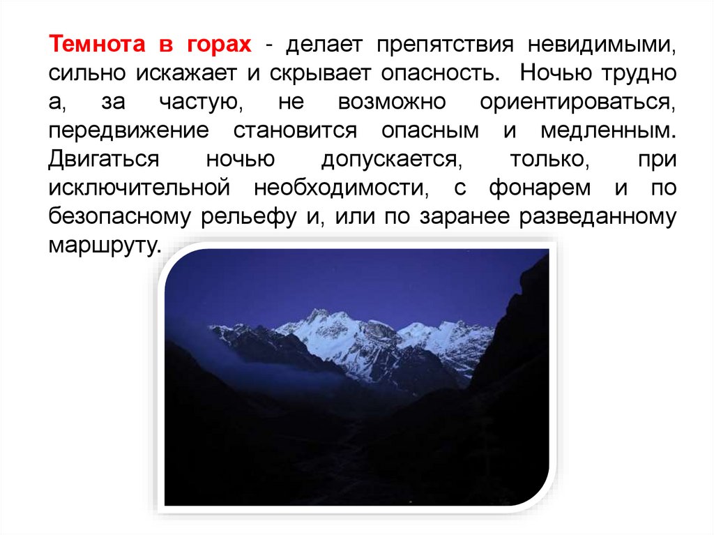 Темнота в горах - делает препятствия невидимыми,сильно искажает и скрывает опасность. Ночью трудно