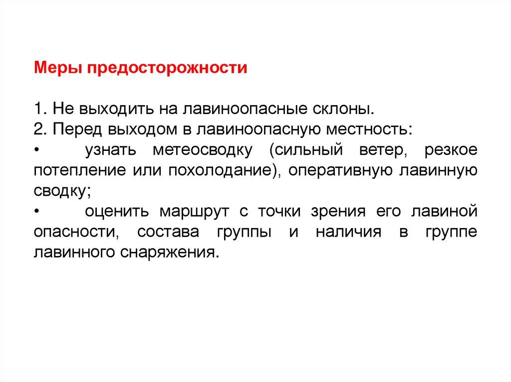 Меры предосторожности1. Не выходить на лавиноопасные склоны.