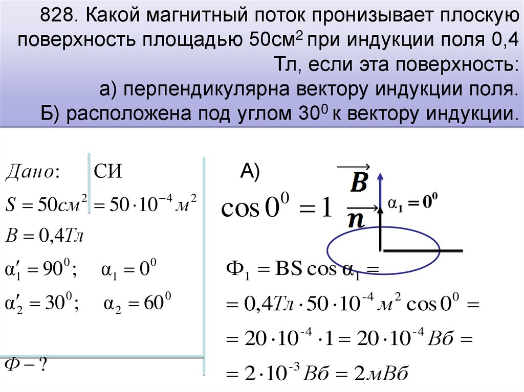 828. Какой магнитный поток пронизывает плоскуюповерхность площадью 50см2 при индукции поля 0,4