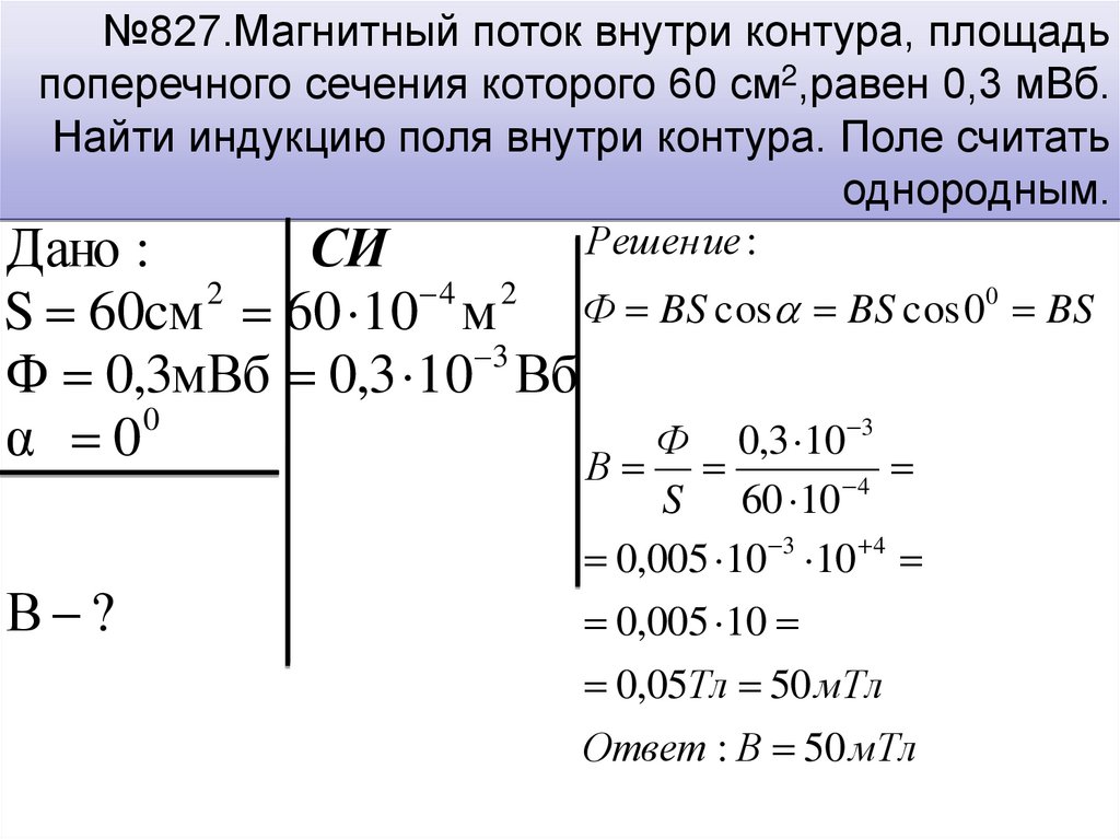 №827.Магнитный поток внутри контура, площадьпоперечного сечения которого 60 см2,равен 0,3 мВб.
