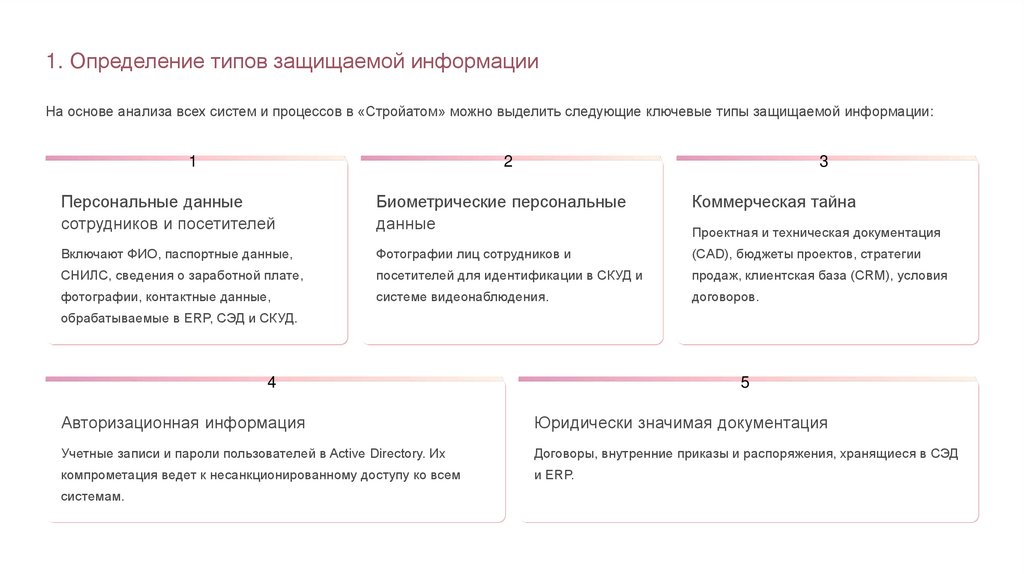 1. Определение типов защищаемой информацииНа основе анализа всех систем и процессов в «Стройатом» можно выделить следующие ключевые типы защищаемой информации: