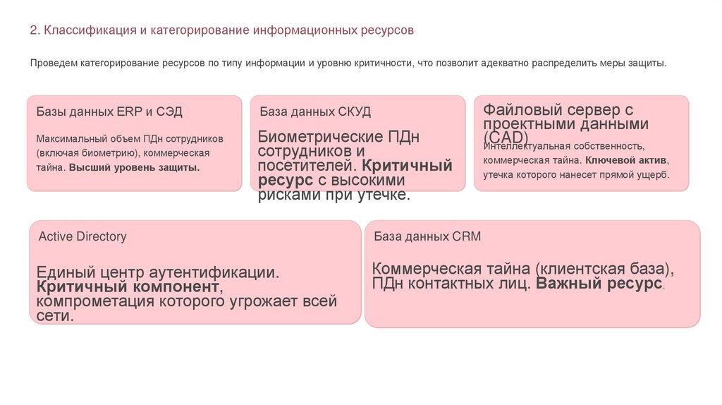2. Классификация и категорирование информационных ресурсовПроведем категорирование ресурсов по типу информации и уровню критичности, что позволит адекватно распределить меры защиты.