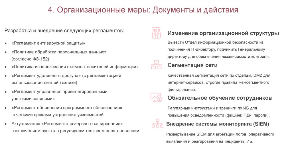 4. Организационные меры: Документы и действияРазработка и внедрение следующих регламентов: