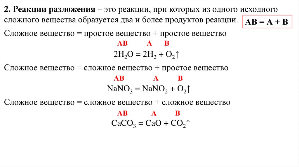 2. Реакции разложения – это реакции, при которых из одного исходногосложного вещества образуется два и более продуктов реакции. АВ = А + В