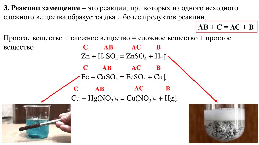 3. Реакции замещения – это реакции, при которых из одного исходногосложного вещества образуется два и более продуктов реакции.