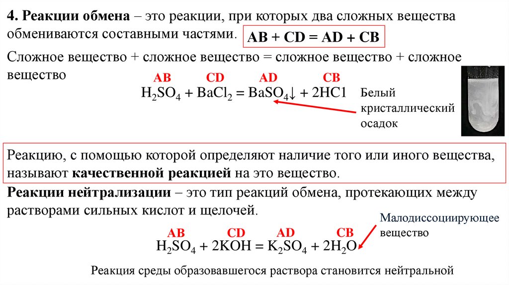 4. Реакции обмена – это реакции, при которых два сложных веществаобмениваются составными частями. АВ + СD = АD + CB