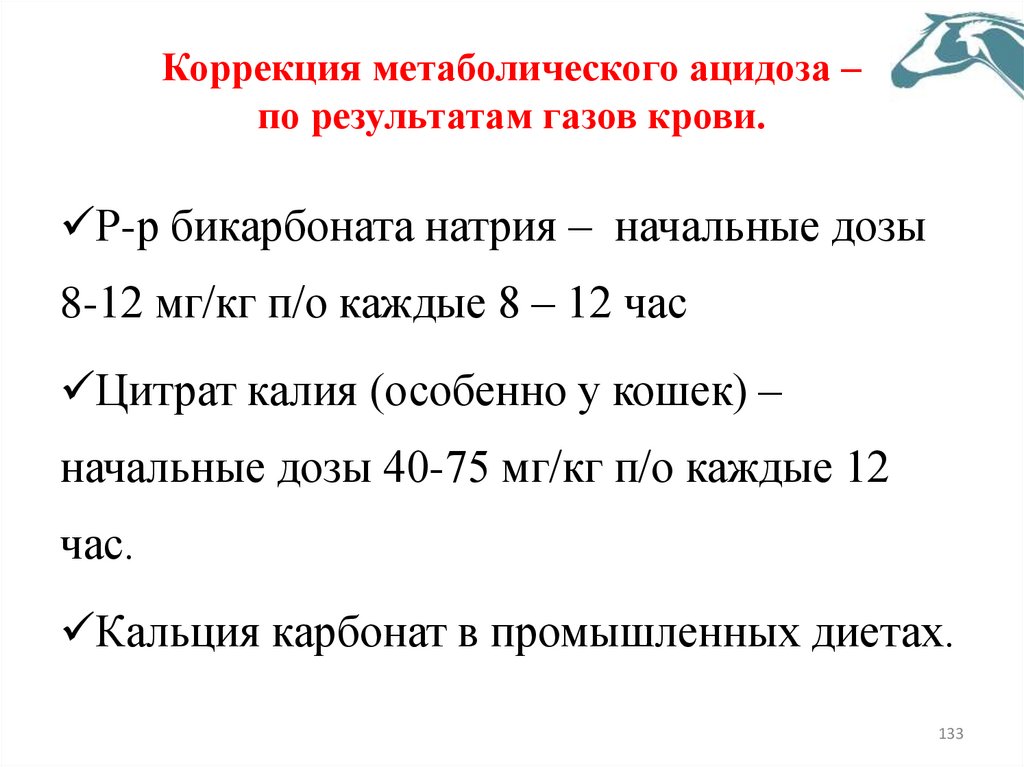 133. Коррекция метаболического ацидоза – по результатам газов крови.
