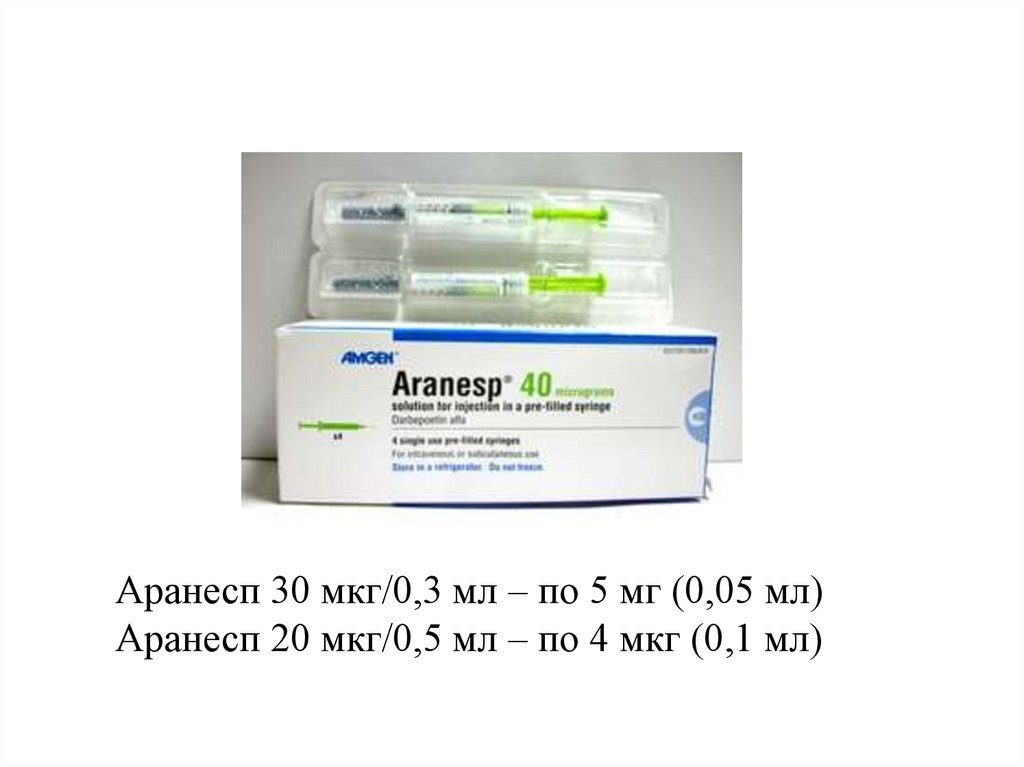 Аранесп 30 мкг/0,3 мл – по 5 мг (0,05 мл)Аранесп 20 мкг/0,5 мл – по 4 мкг (0,1 мл)