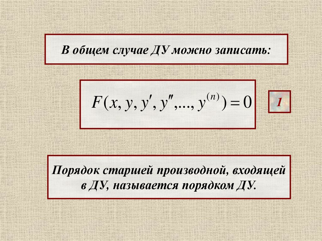 В общем случае ДУ можно записать:F ( x, y, y , y ,..., y ) 0