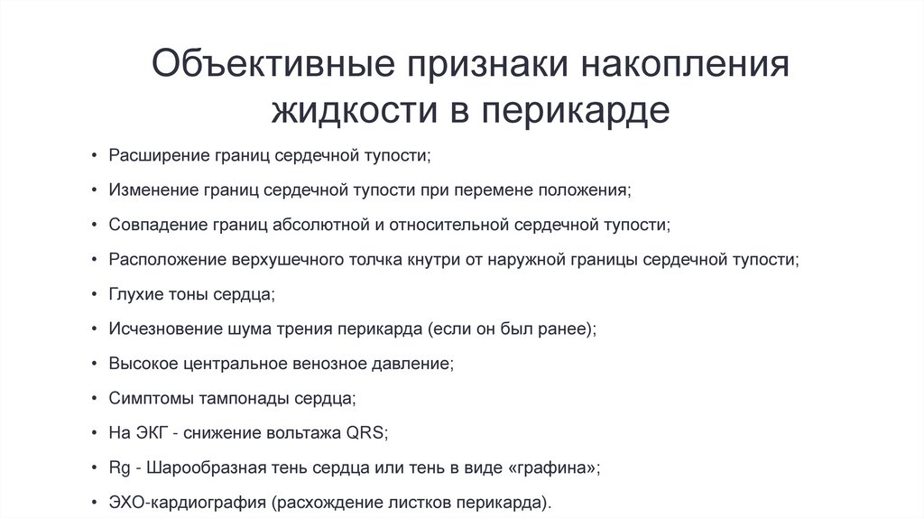 • экссудат: серозный, геморрагический, гнойный и гнилостный (пиоперикард), хилезный (хилоперикард);