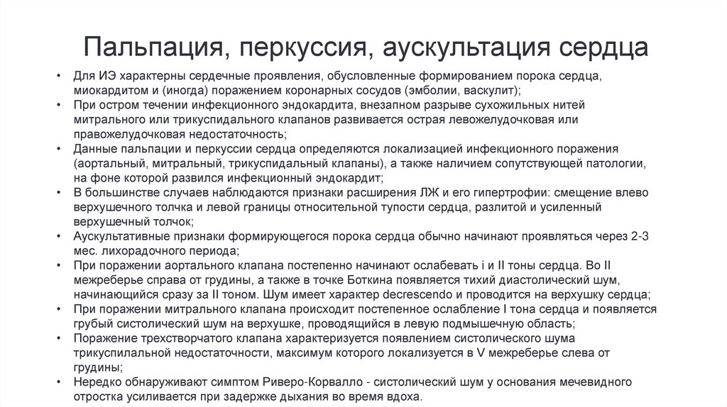 Пальпация, перкуссия, аускультация сердцаДля ИЭ характерны сердечные проявления, обусловленные формированием порока сердца,