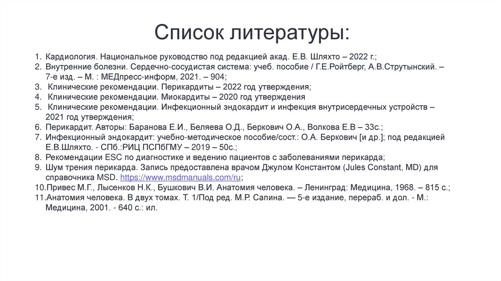 Список литературы:1. Кардиология. Национальное руководство под редакцией акад. Е.В. Шляхто – 2022 г.;