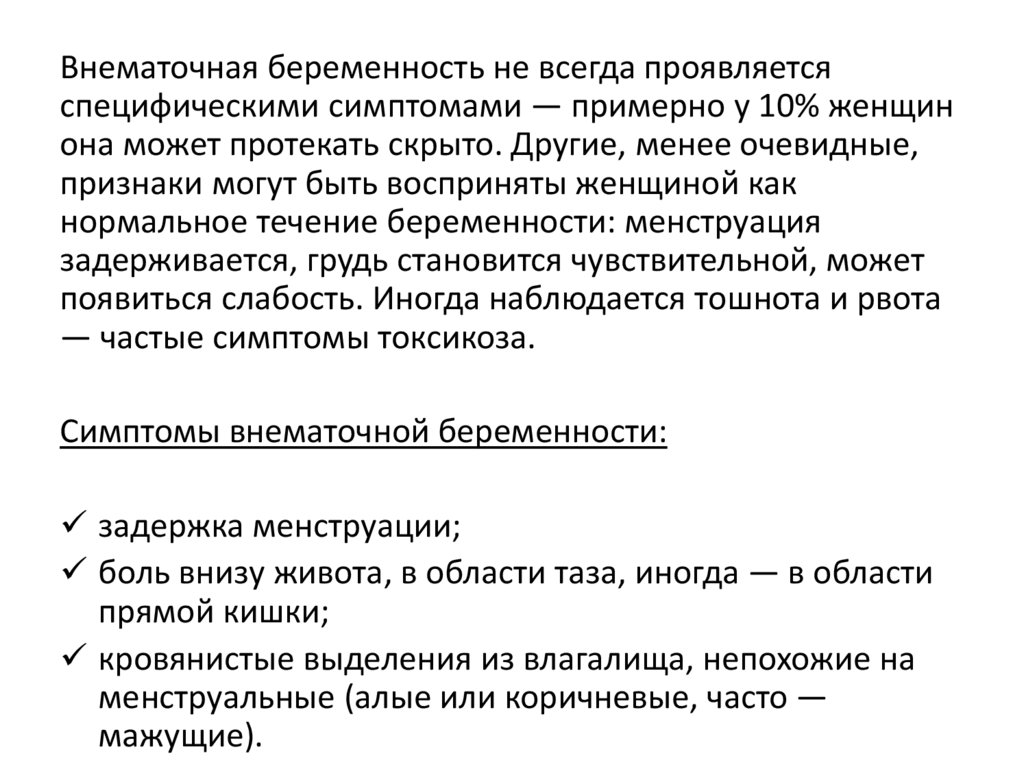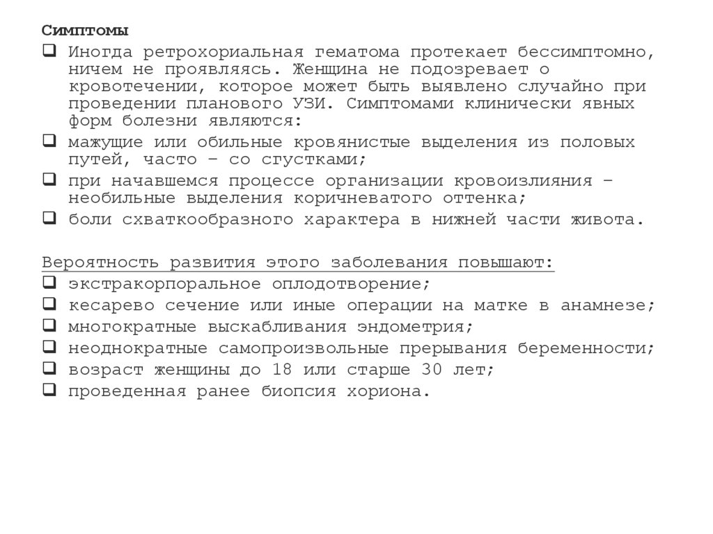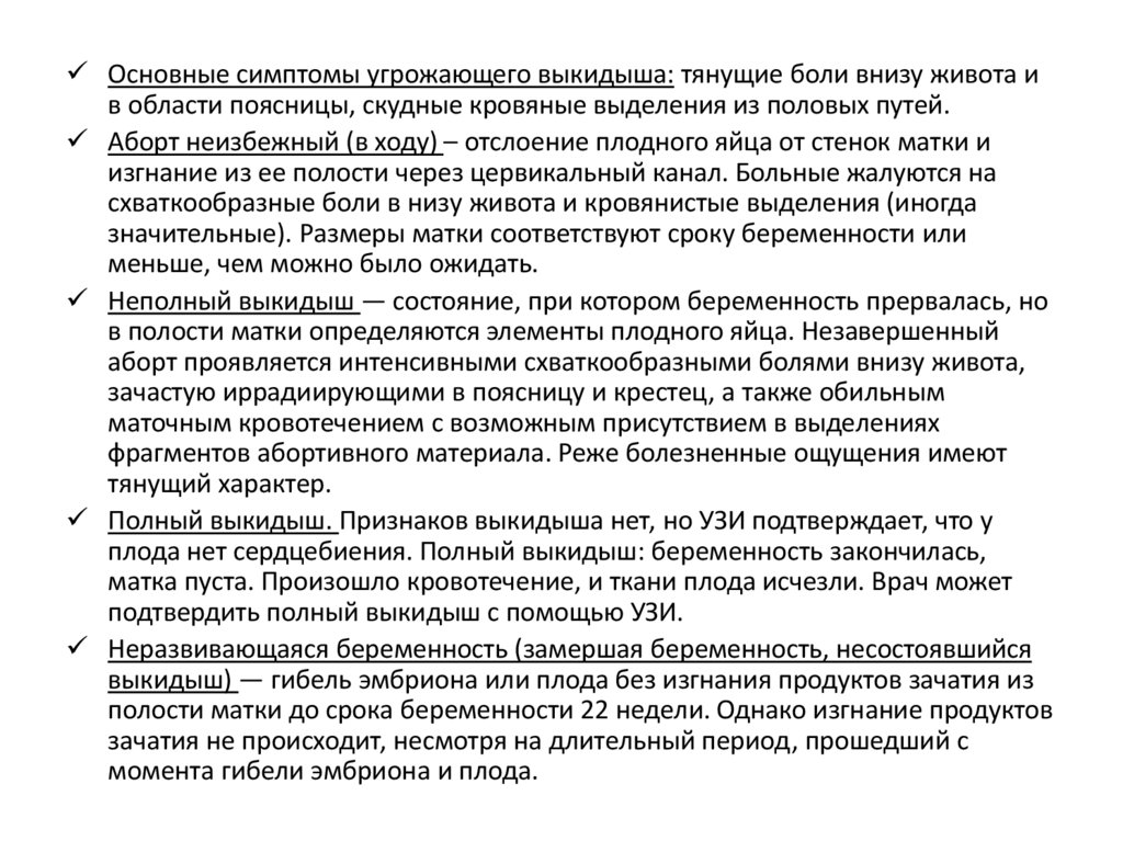 Основные симптомы угрожающего выкидыша: тянущие боли внизу живота ив области поясницы, скудные кровяные выделения из половых путей.
