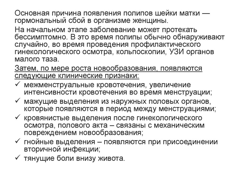 Первые стадии рака шейки матки обычно протекаютбессимптомно. Клинические симптомы свидетельствуют об