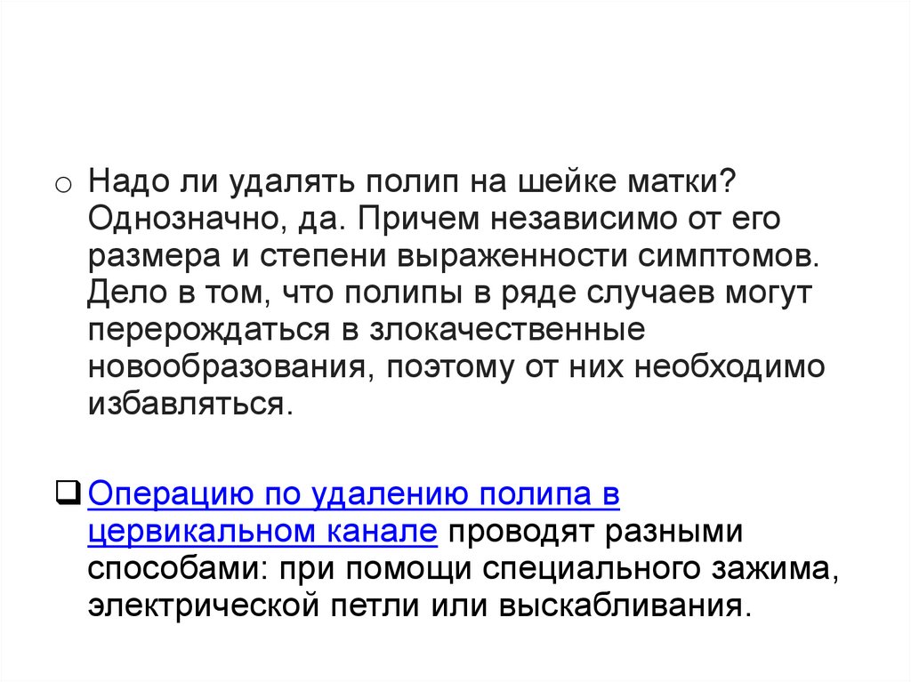 o Надо ли удалять полип на шейке матки?Однозначно, да. Причем независимо от его