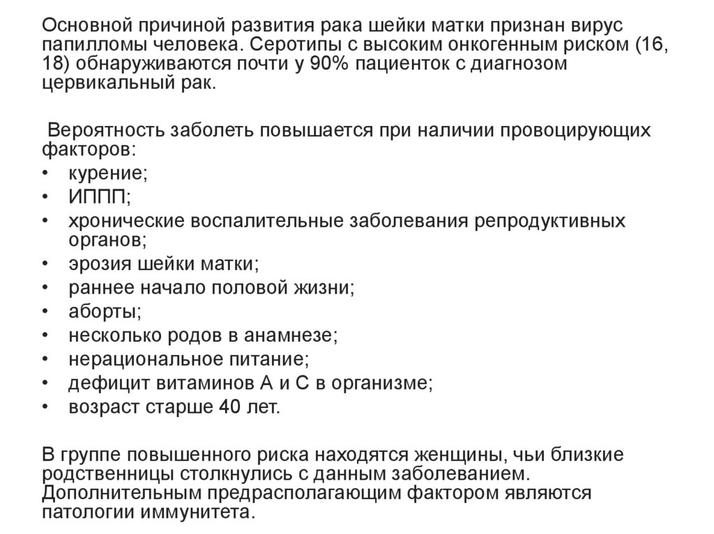 Основной причиной развития рака шейки матки признан вируспапилломы человека. Серотипы с высоким онкогенным риском (16,