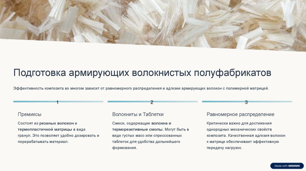 Подготовка армирующих волокнистых полуфабрикатовЭффективность композита во многом зависит от равномерного распределения и адгезии армирующих волокон с полимерной матрицей.