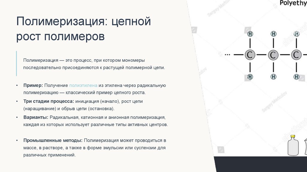 Варианты: Радикальная, катионная и анионная полимеризация,