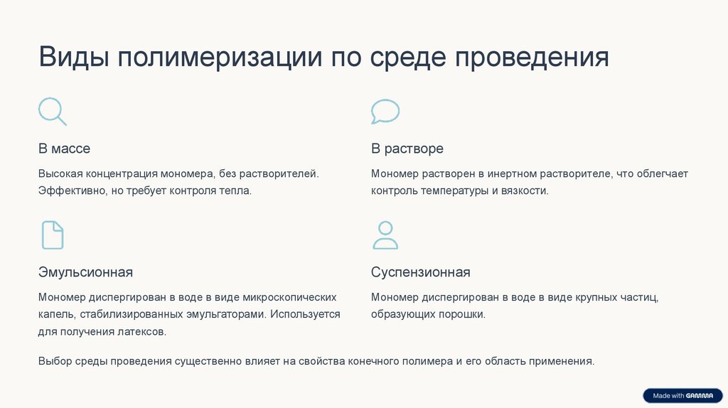 Выбор среды проведения существенно влияет на свойства конечного полимера и его область применения.