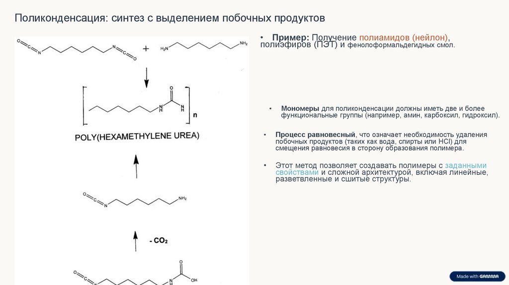 Поликонденсация: синтез с выделением побочных продуктов• Пример: Получение полиамидов (нейлон),