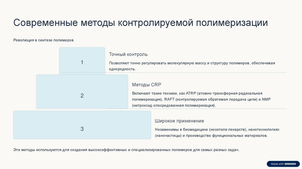 Эти методы используются для создания высокоэффективных и специализированных полимеров для самых разных задач.