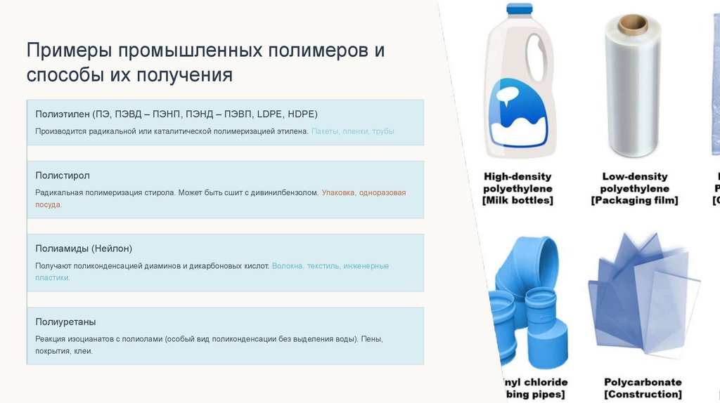 Производится радикальной или каталитической полимеризацией этилена. Пакеты, пленки, трубы.