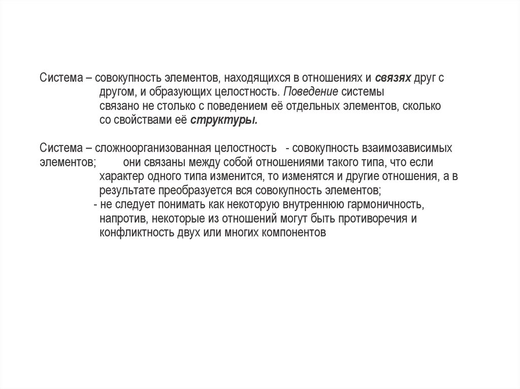 Система – совокупность элементов, находящихся в отношениях и связях друг сдругом, и образующих целостность. Поведение системы